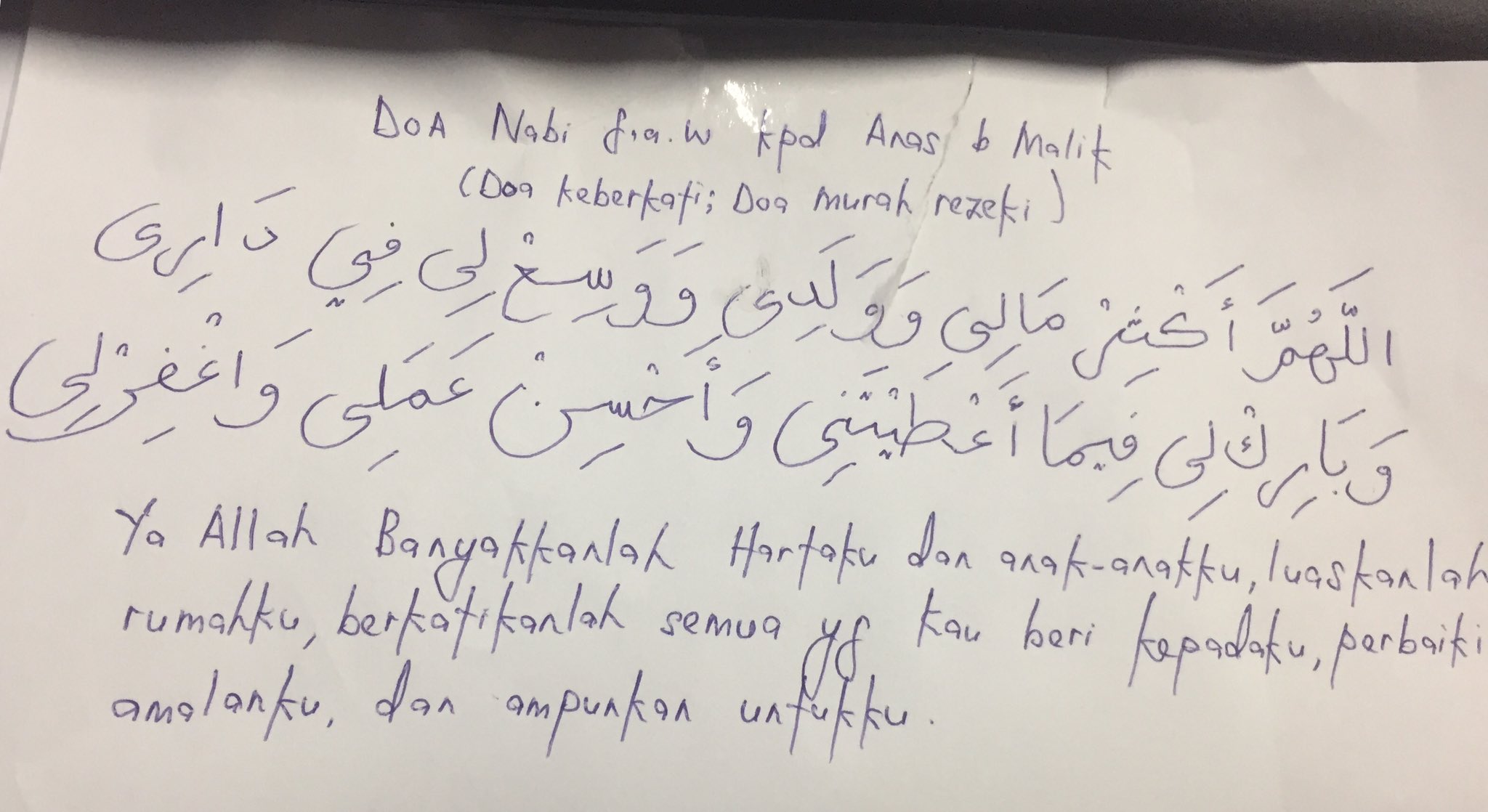 (dibacakan oleh nabi saaw kepada anas bin malik ra). Doa ini dibaca setiap selesai salam shalat subuh. (dibacakan oleh nabi saaw kepada anas bin malik ra). Ya allah, panjangkanlah umur kami, sehatkanlah jasad kami, terangilah hati kami, tetapkanlah iman kami, baikkanlah amalan kami, luaskanlah rezeki kami, dekatkanlah kami pada kebaikan dan jauhkanlah.